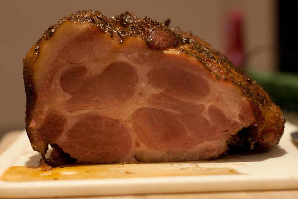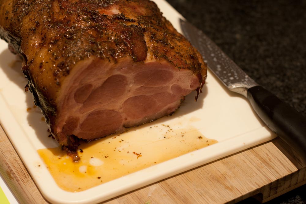Nach guten drei Stunden bei gleichbleibender Hitze hatte das Fleisch eine Kerntemperatur von 65°C. Der Anschnitt bewies: die zarte Rosafärbung war ein starkes Indiz dafür, dass die Pöklung erfolgreich war. Auch der erste Geschmackstest war sensationell: unheimlich saftig und zart.