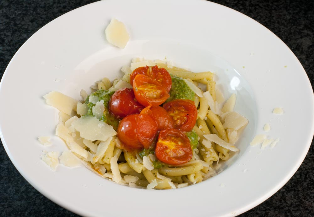 Ein Klassiker aus dem Hause Alfons Schuhbeck. Diesesmal wollte ich sowohl den Geschmack von Pinienkernen als auch den von Mandelstiften spüren. Sonstige Ingredienzien im Pesto: