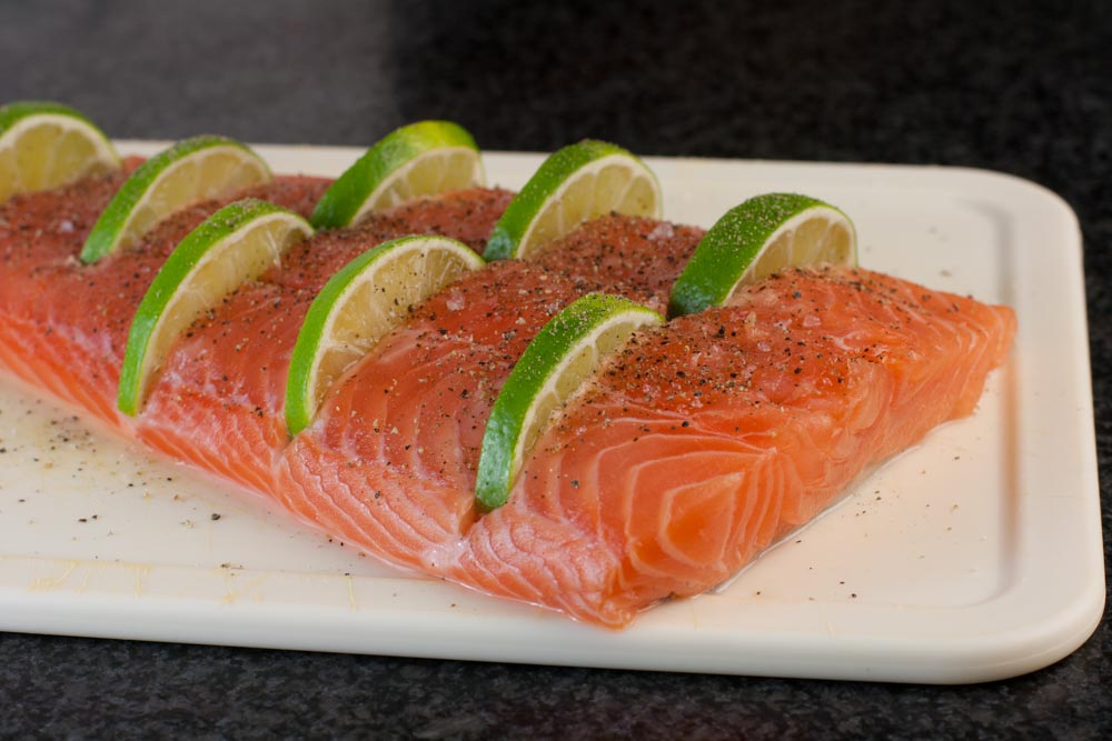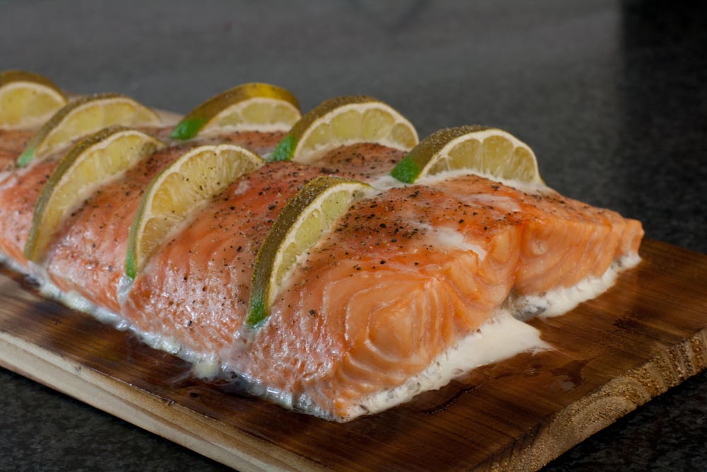 Ein Gericht das ich schon lang einmal probieren wollte. Lachsfilet ganz puristisch mit Fleur de Sel und Pfeffer gewürzt, “gespickt” mit ein paar Limettenscheiben. Und dann einfach so auf einer Zedernplanke auf den vorgewärmten Grill, indirekt gegart bis er schön durch aber immer noch unheimlich saftig ist.