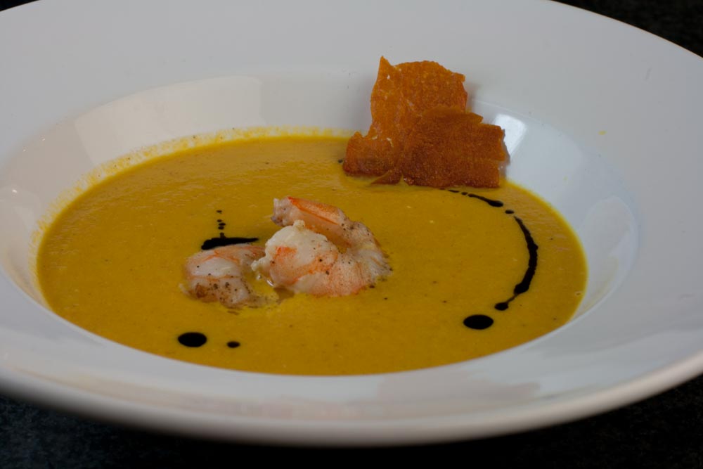 Karotten-Ingwer-Suppe mit Garnelen