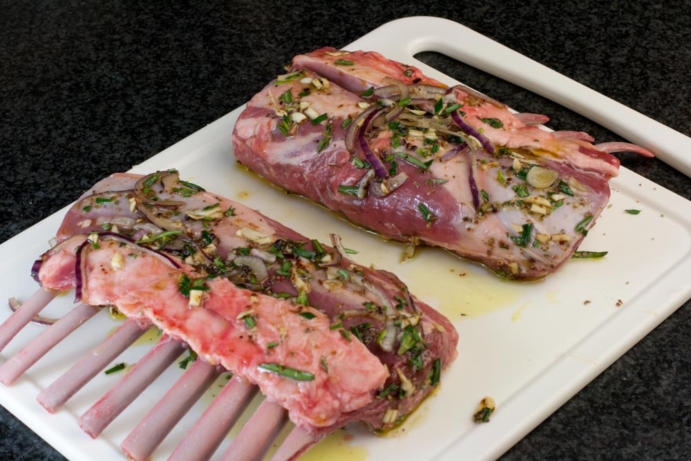 Die Lammracks habe ich schon am Vortag etwas zugeputzt und anschließend mit Olivenöl, Rosmarin, Thymian, Knoblauch, ein paar Zwiebelstückchen sowie Salz, Pfeffer und etwas Mafia Coffee Rub mariniert. Danach kamen sie vakuumiert in den Kühlschrank zum durchziehen.