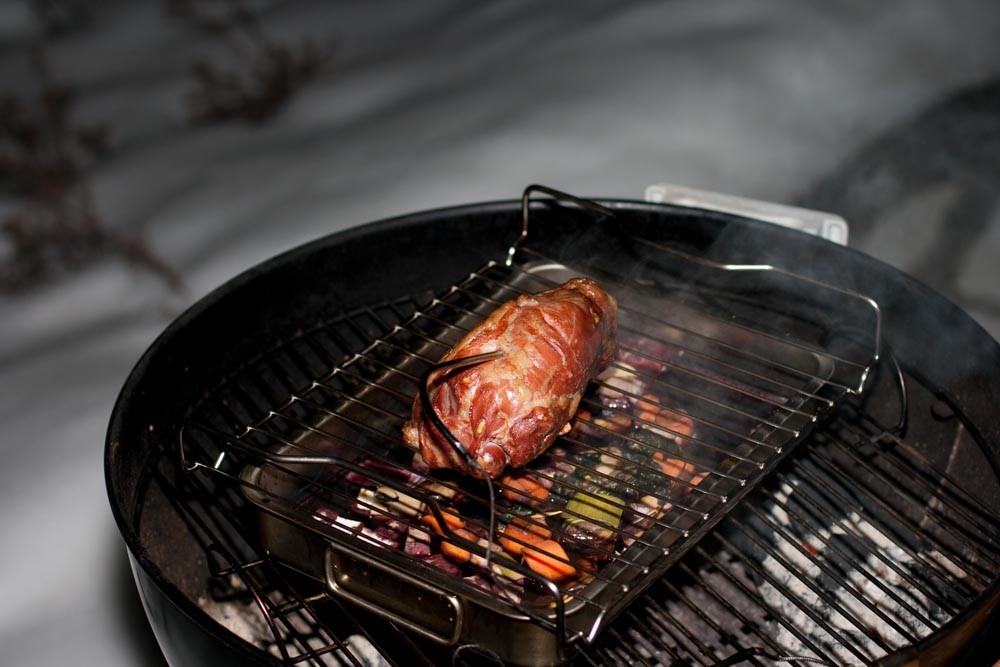 Es gibt mal wieder eine Köstlichkeit vom Grill: Lammstelze. Diese wurde zuvor mit Knoblauchzehen gespickt, mit Salz und Pfeffer gewürzt sowie mit Olivenöl eingerieben. Ein paar Minzblätter noch und einvakuumiert ging es damit ab in den Kühlschrank über Nacht. Diesmal wurde eine Rotweinsauce angesetzt aus kleingeschnittenem Wurzelgemüse, abgelöscht mit Rotwein und Wildfond, einreduziert und dann köcheln lassen. Der Grill wurde mit einem Minion-Ring auf ca. 80°C vorgeheizt, und das Fleisch auf einer Tropfschale gefüllt mit Wurzelgemüse und Rotwein aufgelegt. Ein paar Hickory-Chips sorgten noch für eine leichte Rauchnote.