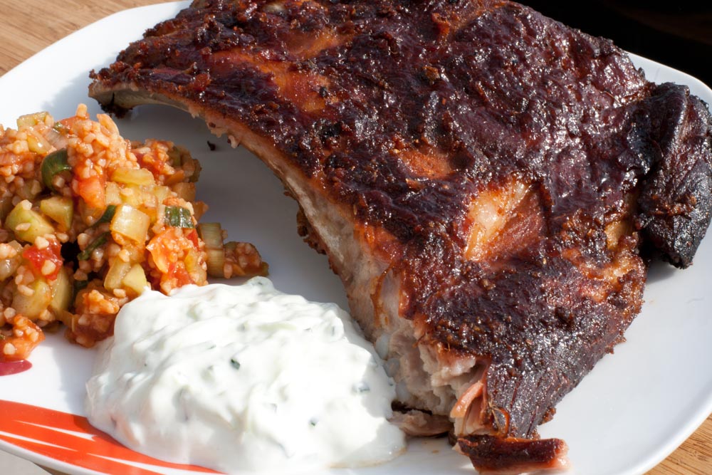 Beim Transport der Spareribs muss man dann schon etwas aufpassen, denn die Knochen lassen sich ohne Mühe aus dem Fleisch ziehen, der Strang fällt fast von selbst auseinander. Dafür wird man mit zartem, purem Fleischgeschmack belohnt. Als Beilage gab es Kisir (Kısır) und griechisches Tzatziki.