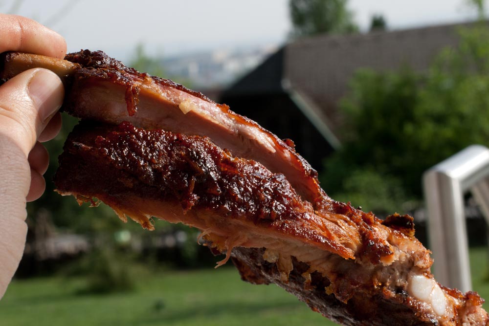 Nachdem ich den Grill vorbereitet habe, kamen die Spareribs für ca. 3 Stunden bei 110°C in leichten Kirschrauch. In der anschließenden Folienphase (eine Auflaufform mit etwas Apfelsaft und Alufolie abgedeckt) kann das Fleisch ca. 2 Stunden dämpfen. Anschließend habe ich die Ribs fürs Finish direkt auf den Rost gelegt und mit einer selbst eingekochten Glacé aus Schwarzkirschmarmelade, Chilisauce, Apfelsaft, einem Schuss Whisky und ein paar Gewürzen glasiert.