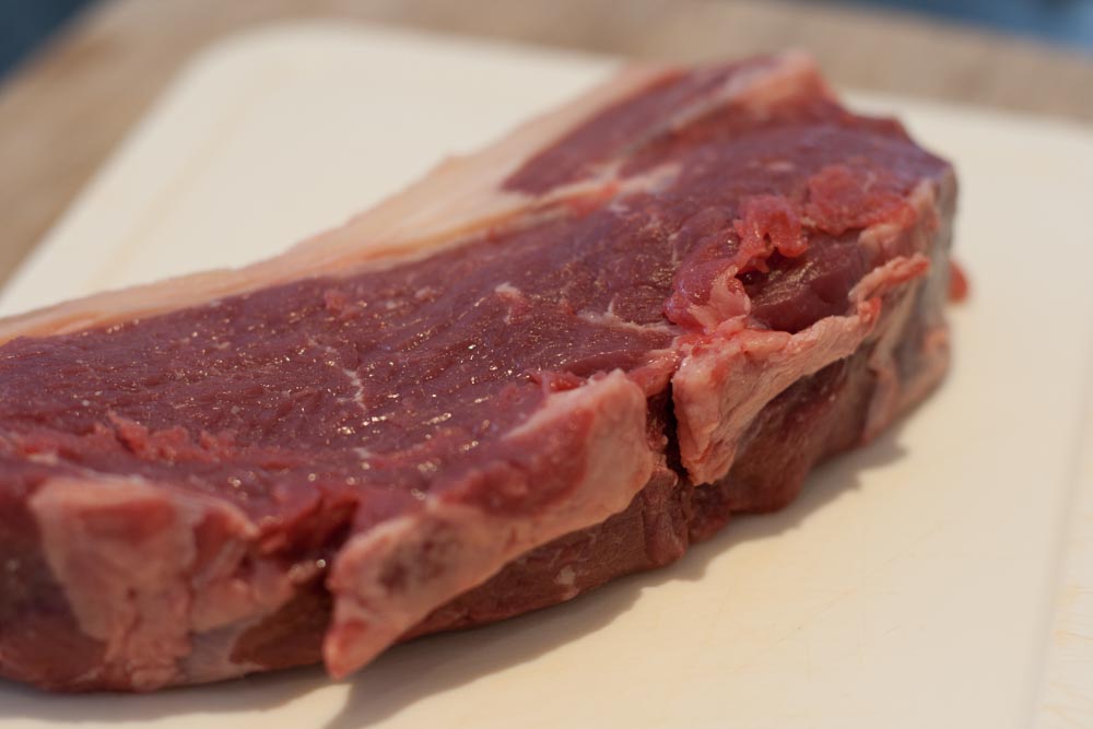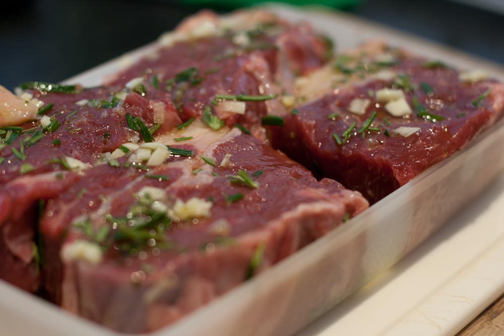 Der Turf-Anteil war in Form eines Entrecôte vom irischen Ochsen. Das Fleisch habe ich in ca. 3,5cm dicke Steaks geschnitten und mit Olivenöl, Knoblauch, Rosmarin und Maldon-Salz unter Vakuum mariniert. Beim “Surf” habe ich mich für King Prawns entschieden. Zuerst kam das Rind auf den Grill, je Seite ca. 3 Minuten direkt über glühender Holzkohle.
