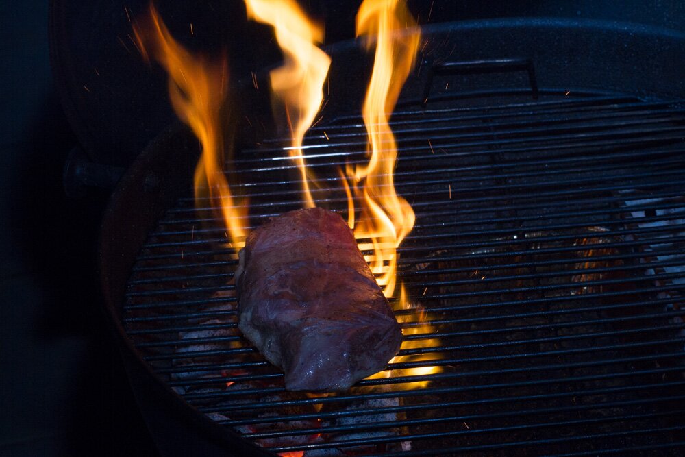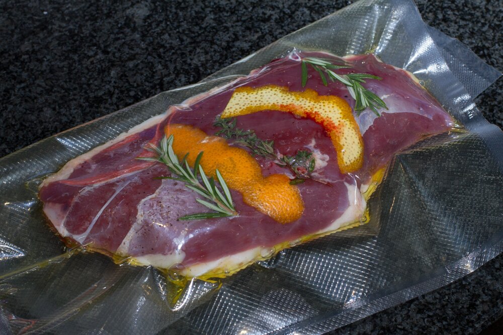 Die Entenbrust habe ich auf der Fettseite kreuzweise eingeschnitten und auf beiden Seiten mit Meersalz eingerieben. Danach wurde sie mit Rosmarin, Thymian, der Schale einer Orange und etwas Olivenöl vakuumiert. Das Sous-Vide Bad wurde auf 58,5°C vorgewärmt und die Entenbrust darin für ca. 2 Stunden liegen gelassen.