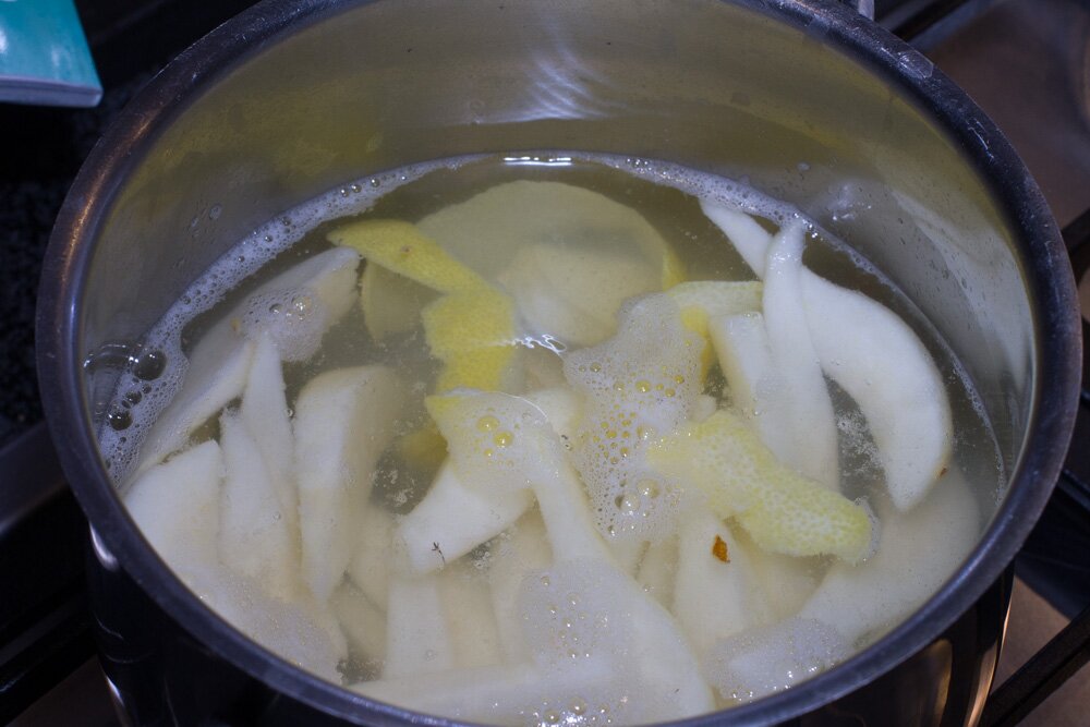 Bei den Birnen ist es wichtig dass man beim Kauf darauf achtet, eher die festen zu bekommen, sie werden schließlich noch gegart. Ich habe sie geschält, das Kerngehäuse entfernt und danach die Birnen in Spalten geschnitten. Wasser wurde in einem Kopf zum Kochen gebracht, und mit Honig, Zitronenschale und dem Saft einer halben Zitrone vermengt. Darin habe ich die Birnenspalten blanchiert, mit einer Schaumkelle aus dem Sud geholt und mit dem restlichen Zitronensaft beträufelt im Kühlschrank abkühlen lassen. Für den Fenchelsalat wurde der Fenchel geputzt und in ganz feine Scheiben gehobelt, mit Zucker und Salz verknetet sowie mit Balsamicoessig, dem frisch gepressten Saft einer Orange und ein paar Orangenfilets mariniert. Als besondere Geschmacksnote kamen noch geriebener Ingwer sowie gezuckerte Cranberries dazu.