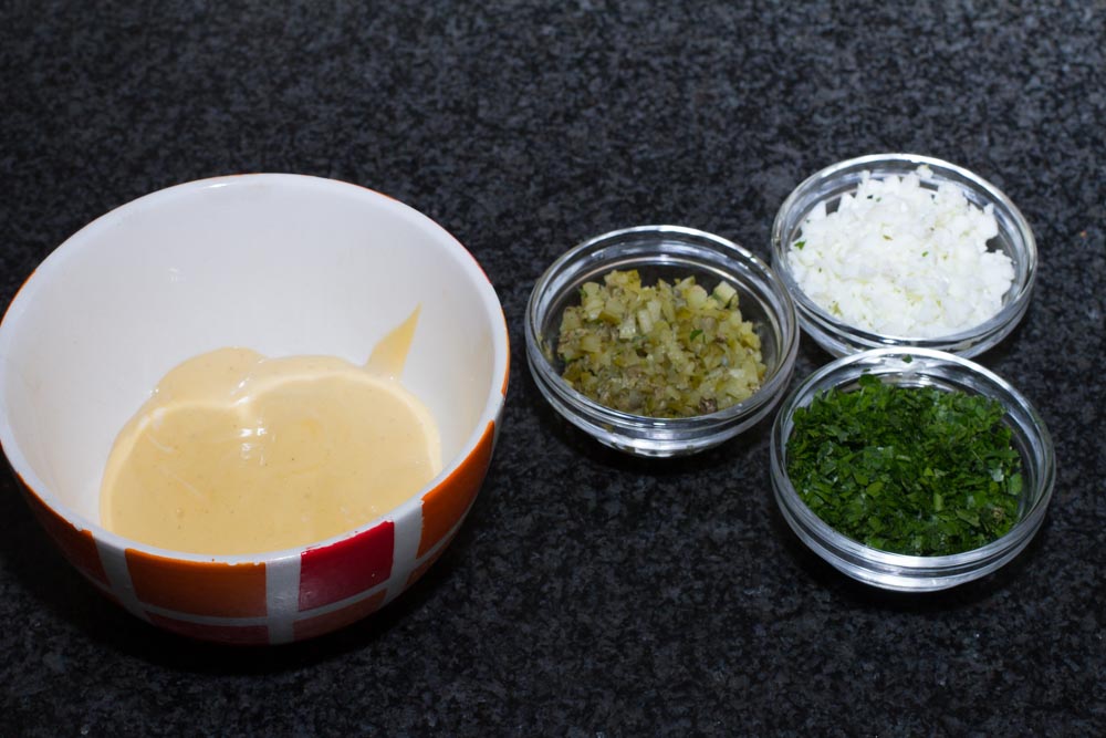 Bei der Sauce habe ich mich für eine Sauce Tartare entschieden. Aus einem Eigelb, Senf, Salz, Pfeffer, Apfelessig habe ich mit dem Pürierstab unter Zugabe von Rapsöl eine Blitzmayonnaise hergestellt. Hinein kamen noch ein gehacktes hartgekochtes Ei (ohne Dotter), klein gehackte Kapern und Essiggurkerl sowie gehackte Petersilie.