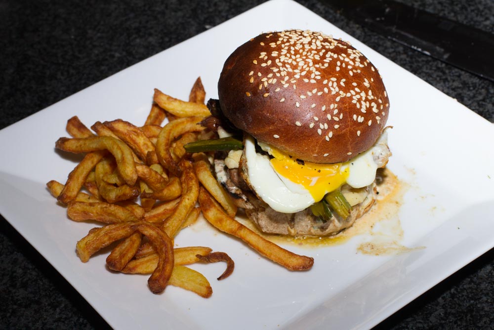 Die Buns wurden diesmal im Grill gebacken (ca. 10 Minuten bei 240°), den grünen Spargel habe ich mit Salz und Pfeffer gewürzt und mit frisch gepresstem Orangensaft mariniert und ebenfalls indirekt auf dem Grill gegart. Auf die Unterseite des Buns kam etwas Sauce Tartare, dann das gegrillte Rindfleisch-Patty (mit Cheddar belegt), der Spargel sowie ein Spiegelei.