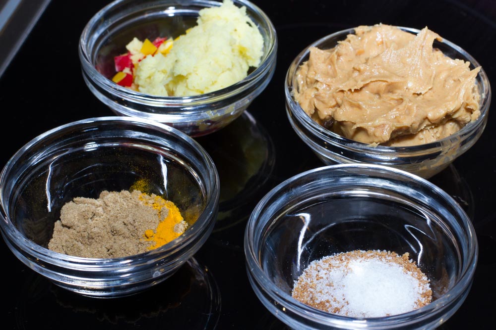 Für die Saté Sauce habe ich Öl in einer Pfanne erhitzt und darin Schalotten und Knoblauch angebraten. Weitere Zutaten: gemahlener Koriander, Kurkuma, Kokosblütenzucker, 2 kleingehackte Chilies, geriebener Ingwer, Salz, Erdnussbutter (crunchy), Kokosmilch und etwas Wasser. Die Gewürze wurden anfrittiert, mit dem Wasser abgelöscht, die Chillies und der Ingwer dazugegeben, etwas gedünstet und dann kam der Rest dazu. Das ergibt eine interessante Konsistenz, die beim Abkühlen noch fester wird.